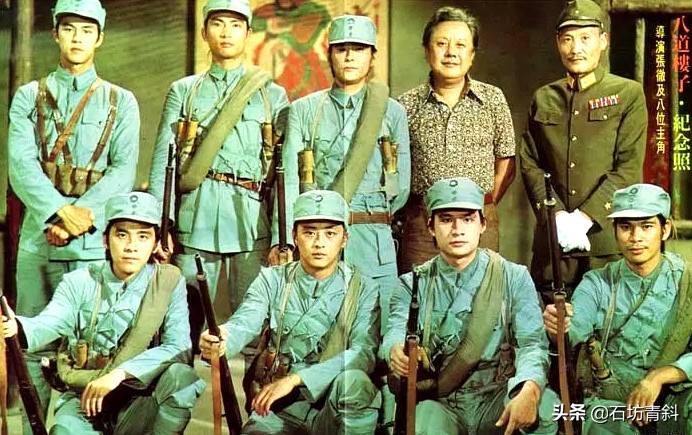 电影《八道楼子》 (1976)主创合影:前排从左至右:姜大卫、李艺民、傅声、陈观泰;后排从左至右:狄龙、戚冠军、程天赐 、张彻、苗天