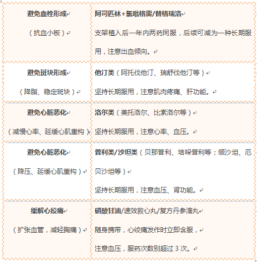 心肌梗死支架植入后,需要服用多种药物共同保护心脏结构和功能,暮烟用表格的方式列举了常规冠心病二级预防的用药策略,但心内科医生会跟据患者具体情况量体裁衣,制定最适宜的用药方案,作为患者只需要遵循医嘱,按时按量服用药品就好。