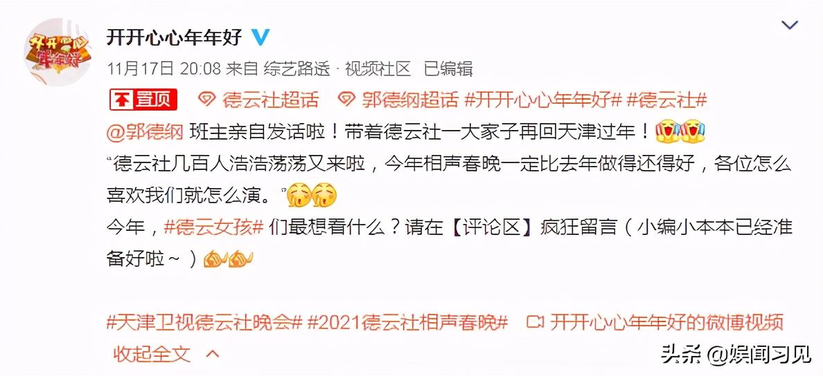 在12月14号中午,天津卫视相声春晚节目组“开开心心年年好”官博放出了几张已经确认参演相声春晚的德云社演员的海报,本想着会收到德云社粉丝的好评,谁知却翻车被骂。为啥翻车,因为这次海报设计者的“神操作”使得此次微博翻车,甚至遭到了德云社众多粉丝的围攻。