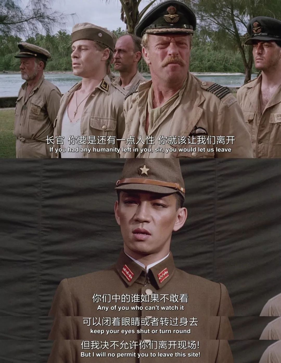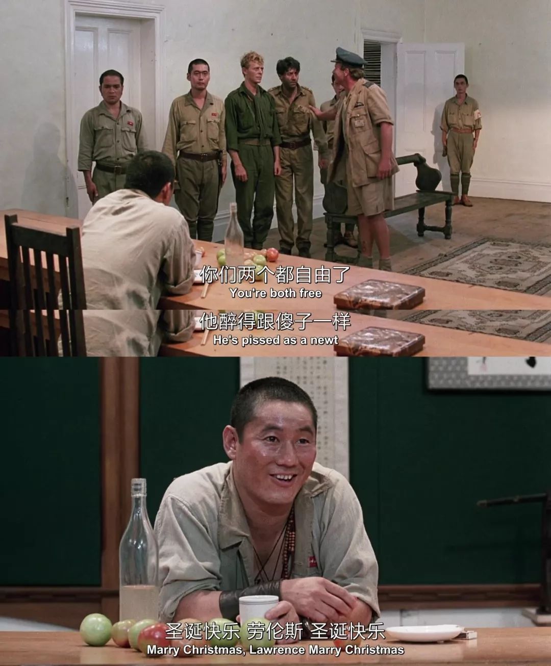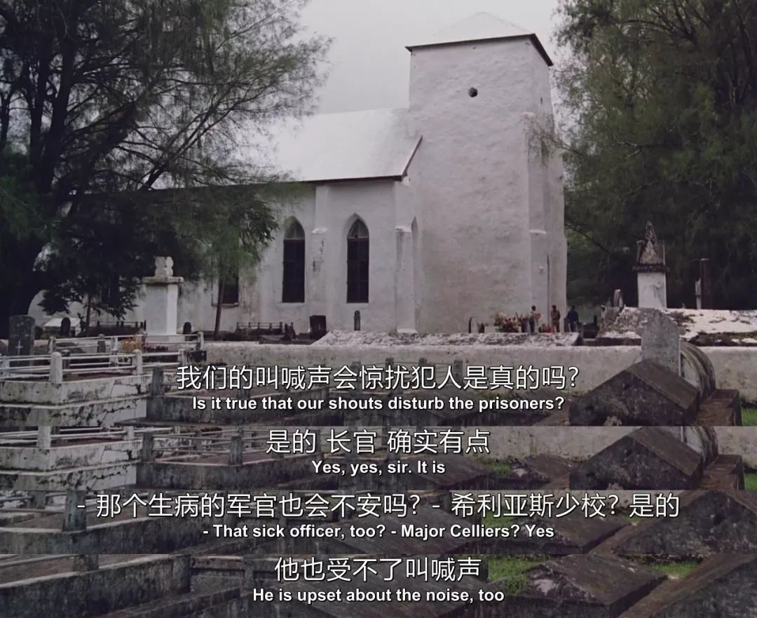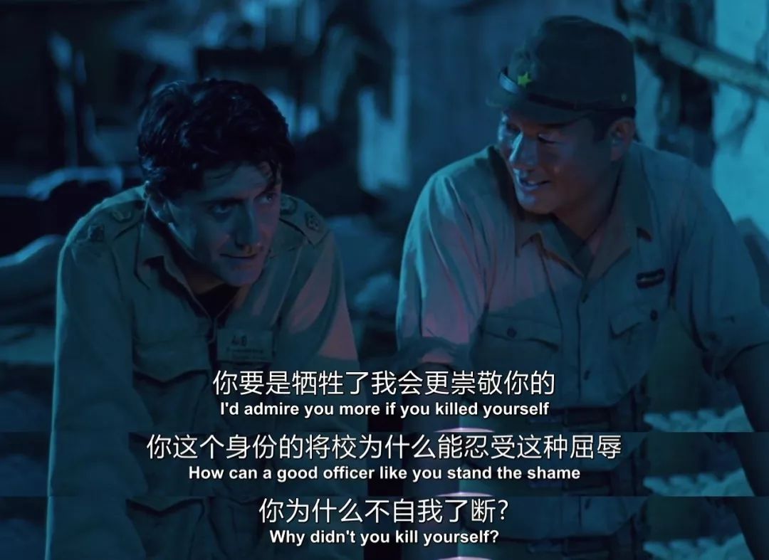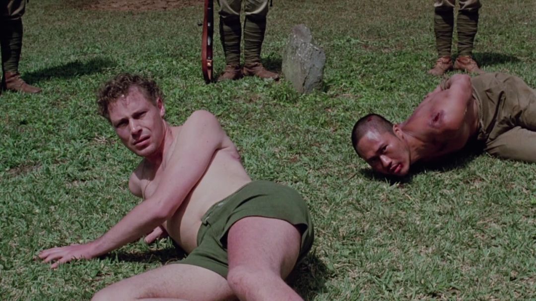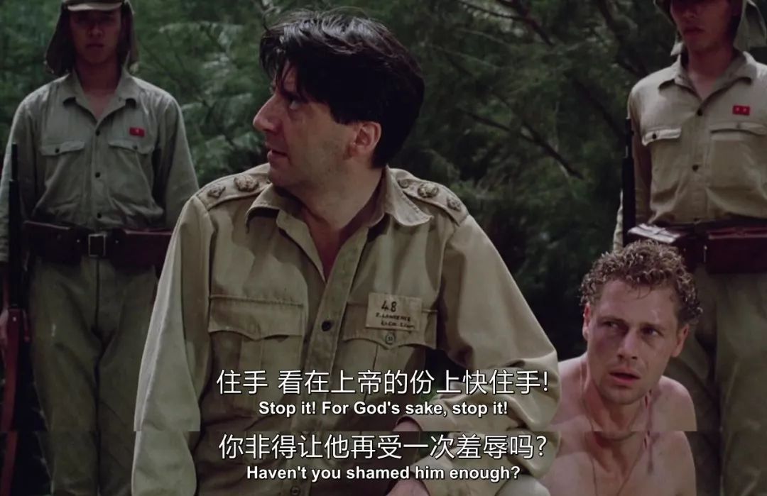 精通日语的英军俘虏劳伦斯(汤姆·康蒂饰)适时地站了出来,阻止了眼前的闹剧,也喊来了不远处的世野井。