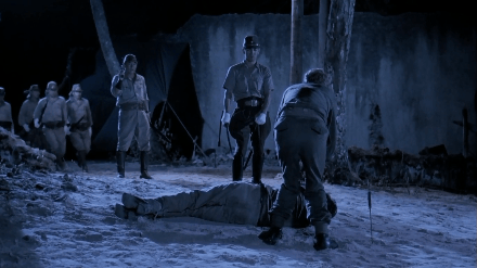朝鲜警卫金本在夜晚巡逻时,溜进荷兰士兵德荣的牢房,被抓了个正着。