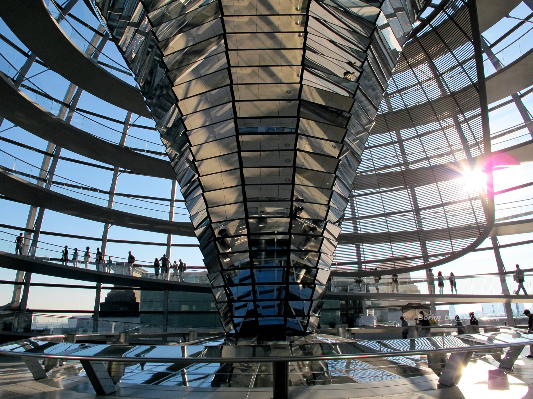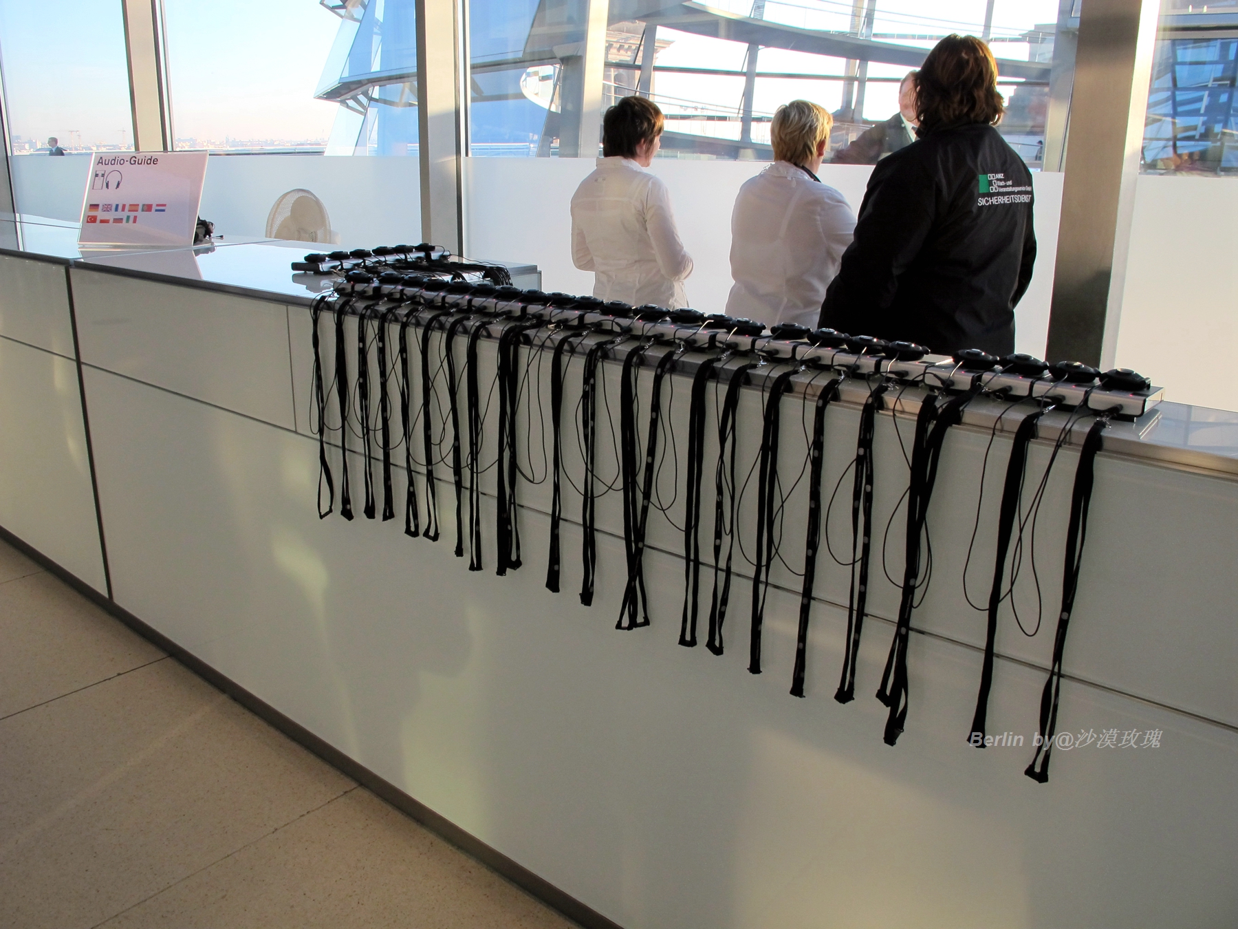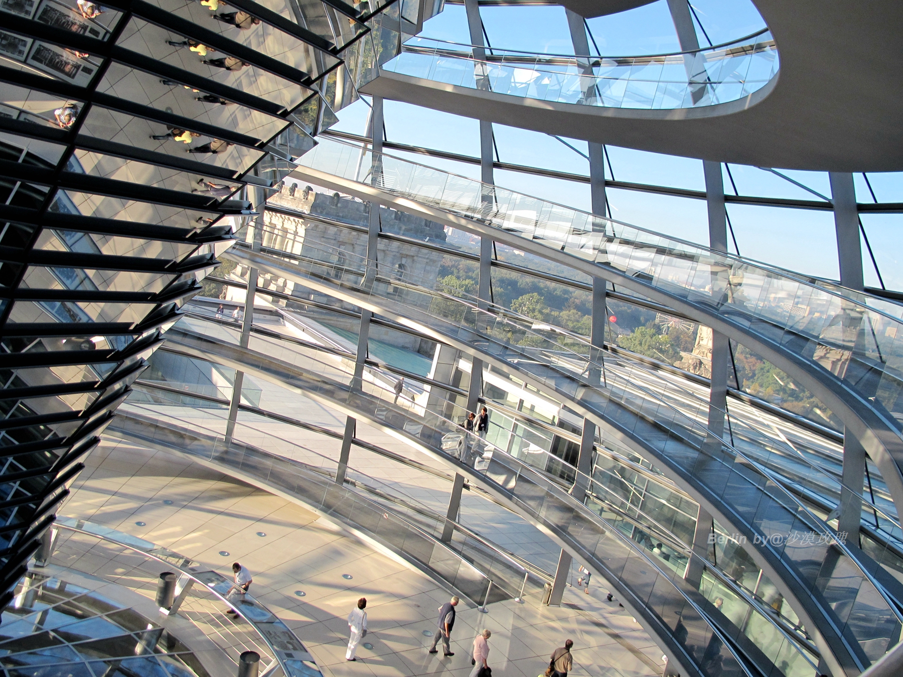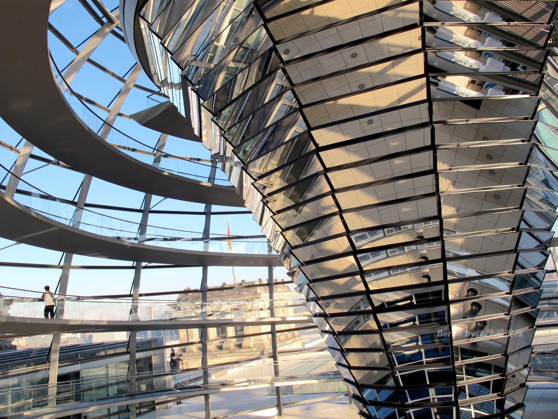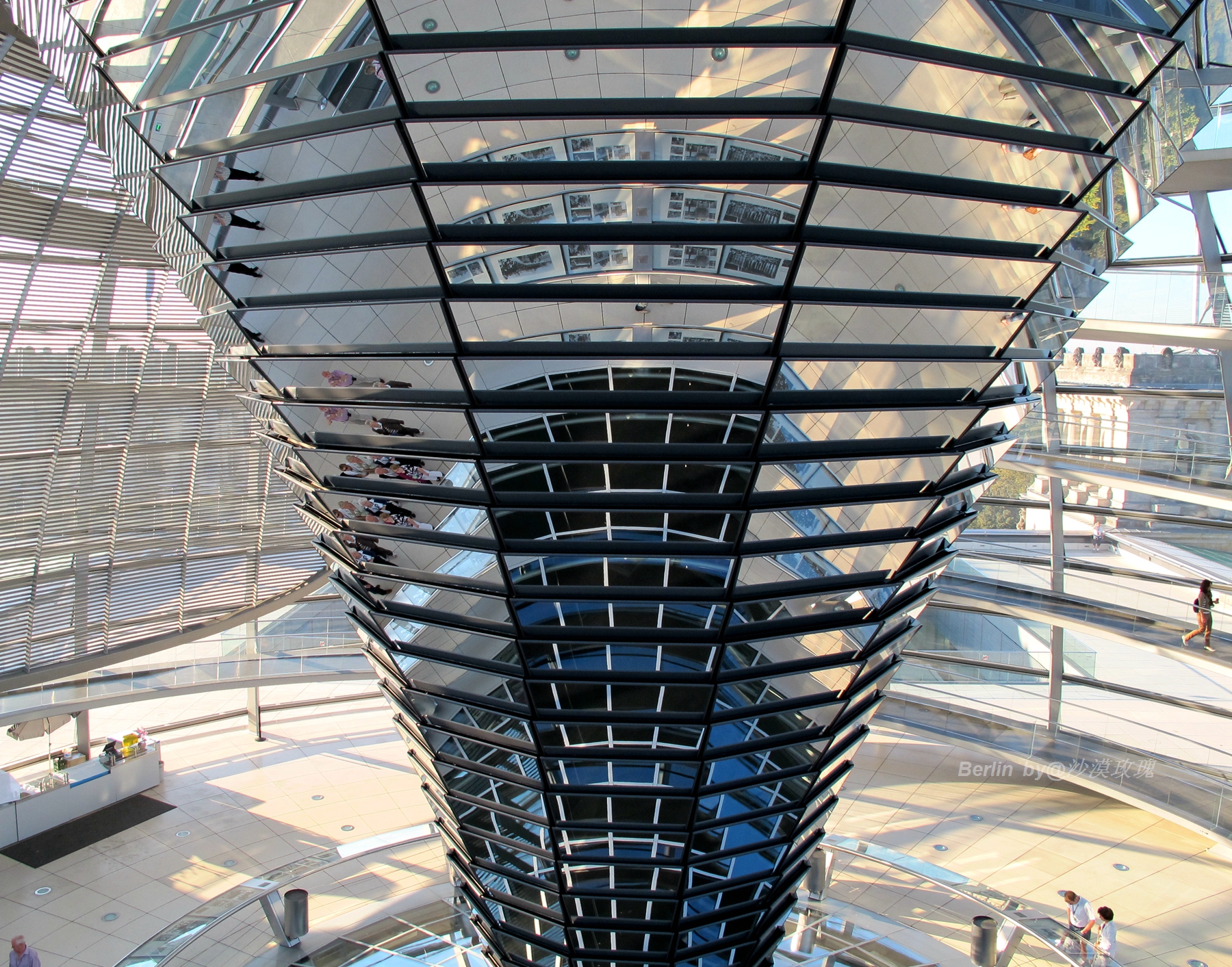 国会大厦的参观可以在官网选择不同的选项,我预约的是参观穹顶。步入穹顶,一朵巨大的镶满镜子的“玻璃花”映入眼帘,拔地而起直通穹顶。穹顶高23.5米,直径40米,有两条螺旋式坡道,各长约230米,沿坡道上行可到达47米高的瞭望平台。游客行走在坡道上也是大厦里一道亮丽的风景线。导览器可以跟随游客的脚步自动智能讲解,详细描述了历史事件和建筑特点,底层圆圈四周陈列有国会大厦重要历史时刻的图片资料,让游客更方便了解大厦和周围的地标性建筑。