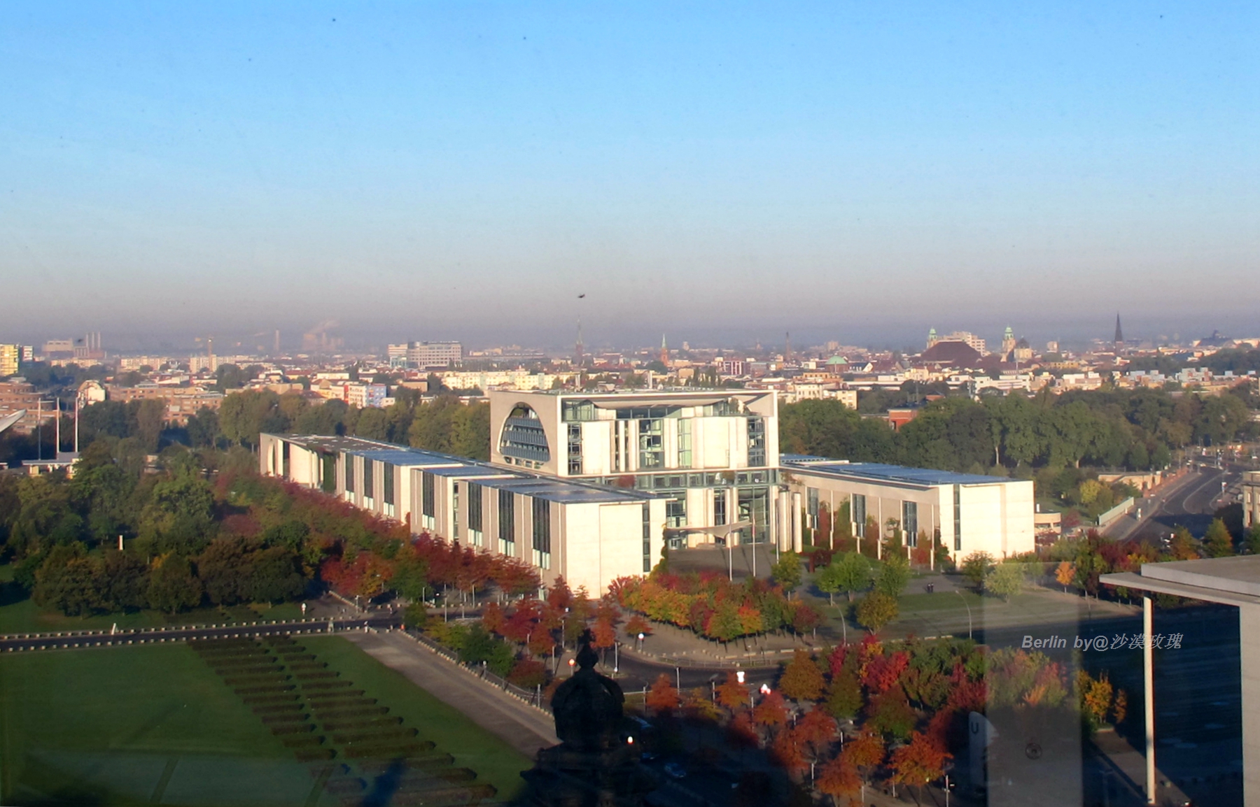 从楼顶远远望去,国会大厦北侧有一座华丽的现代h型建筑被施普雷河一分为二,中间通过栈桥相连。它是联邦总理府(bundeskanzleramt),又名“保罗·洛贝之家(paul-l?be-haus)”,是联邦议会的附属建筑,以第一届联邦议会主席命名,2001年启用至今,两任德国总理(施罗德、默克尔)都在此办公。中间主建筑高9层,两侧延伸低层长条形侧翼,柏林墙就曾在这个位置,因此它也象征着东西德的统一。