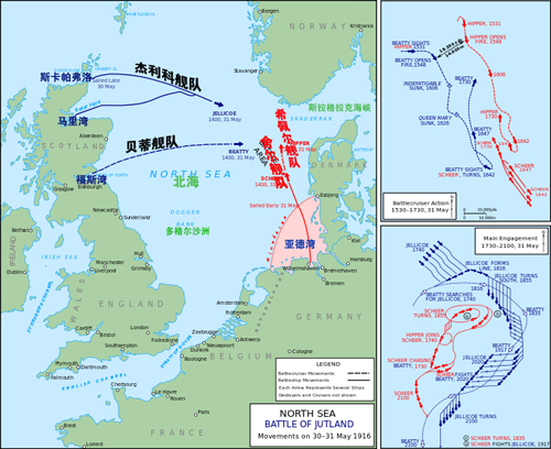 20:00 希佩尔被迫放弃遭到重创的"吕佐夫"号战列巡洋舰换乘受伤较轻的"毛奇"号,杰里科命令舰队重新转向170度。
