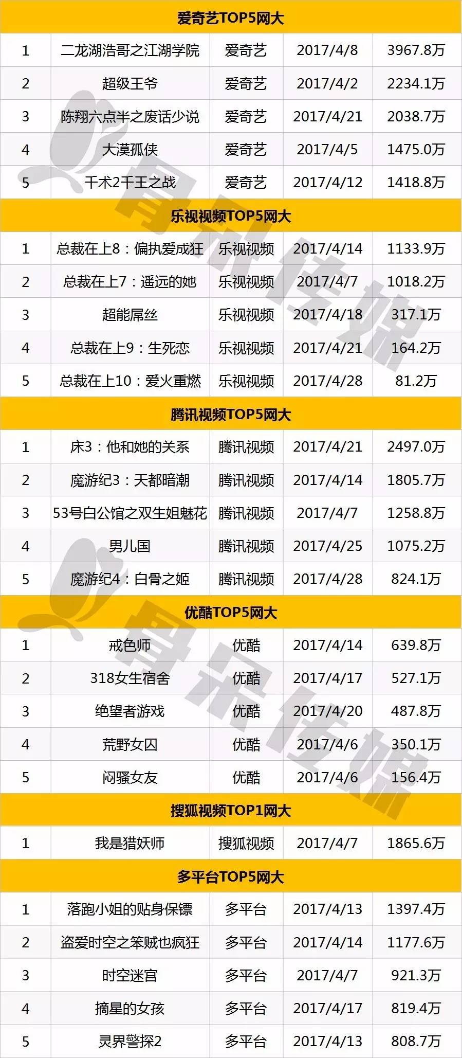 2017年4月独播&多平台网大播放量top5