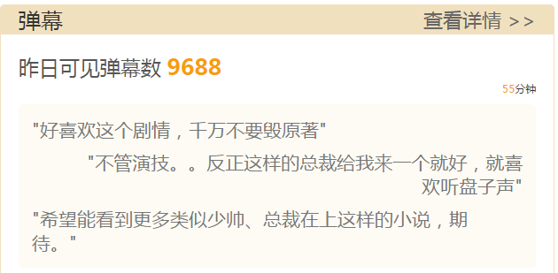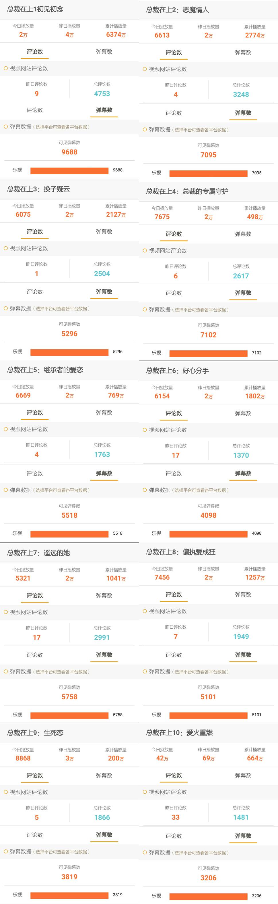 截至2017年5月10日,《总裁在上》系列十部网大总播放量累计超1.75亿,评论量累计达24542条,可见弹幕数累计达56681条。弹幕和评论主要集中在“剧情是否还原小说”、“男女主人设”等方面。