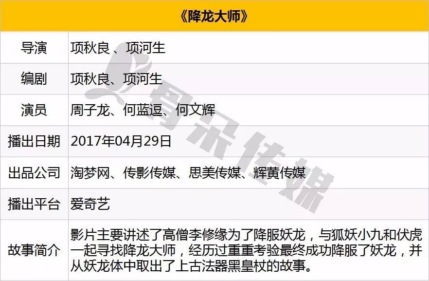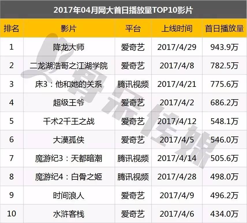 4月,爱奇艺独播网大《降龙大师》以943.9万的首日播放量排名第一