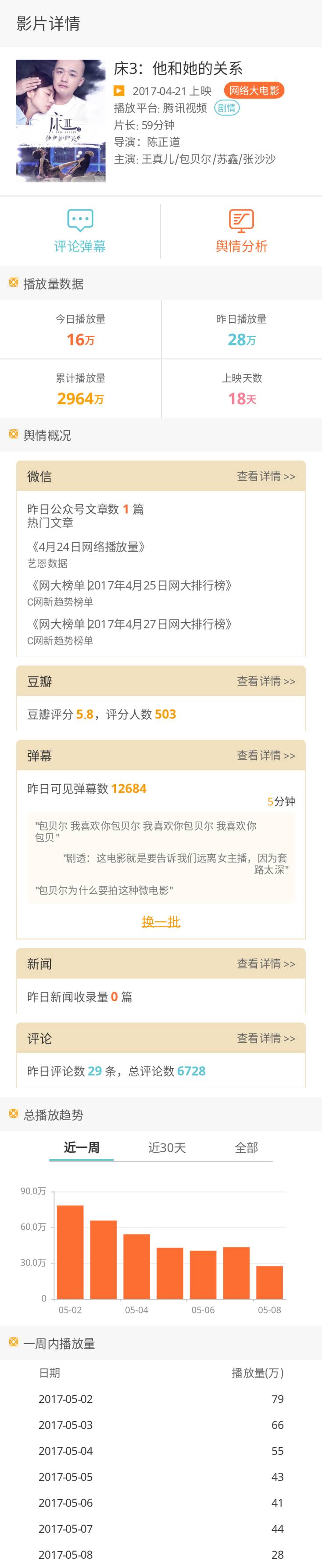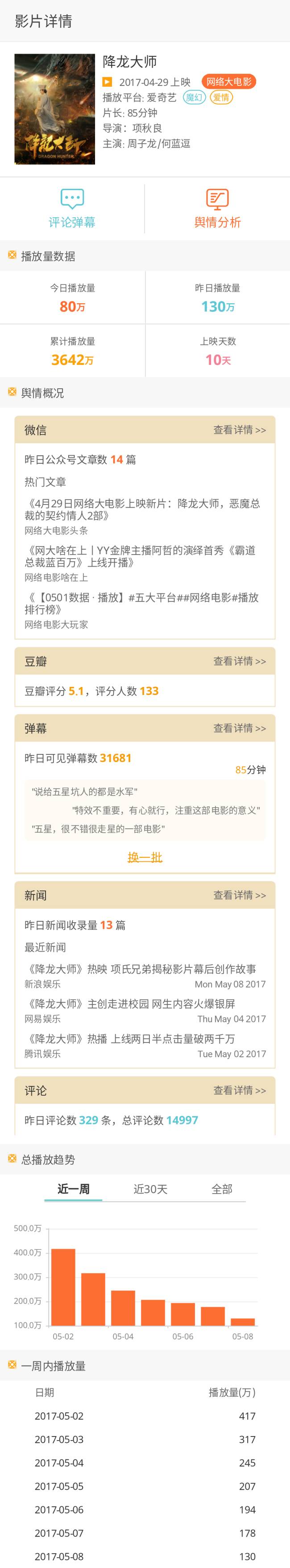 该片自4月29日上线一周以来,在次日达到高峰760.6万后,日播放量持续下降。