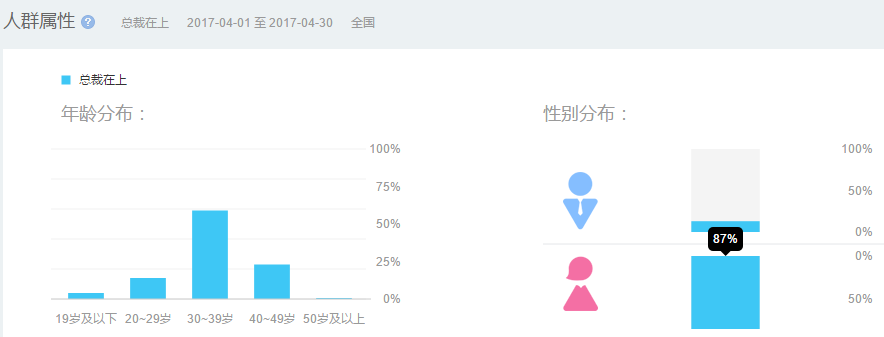 从百度指数人群属性可以看到,《总裁在上》更吸引女性观众和30-39岁年龄层人群的喜爱。性别分布上,女性观众占比83%;年龄分布上,30-39岁这个年龄段的人群占比最高,达到59%,其次是40-49岁年龄段,占比23%。