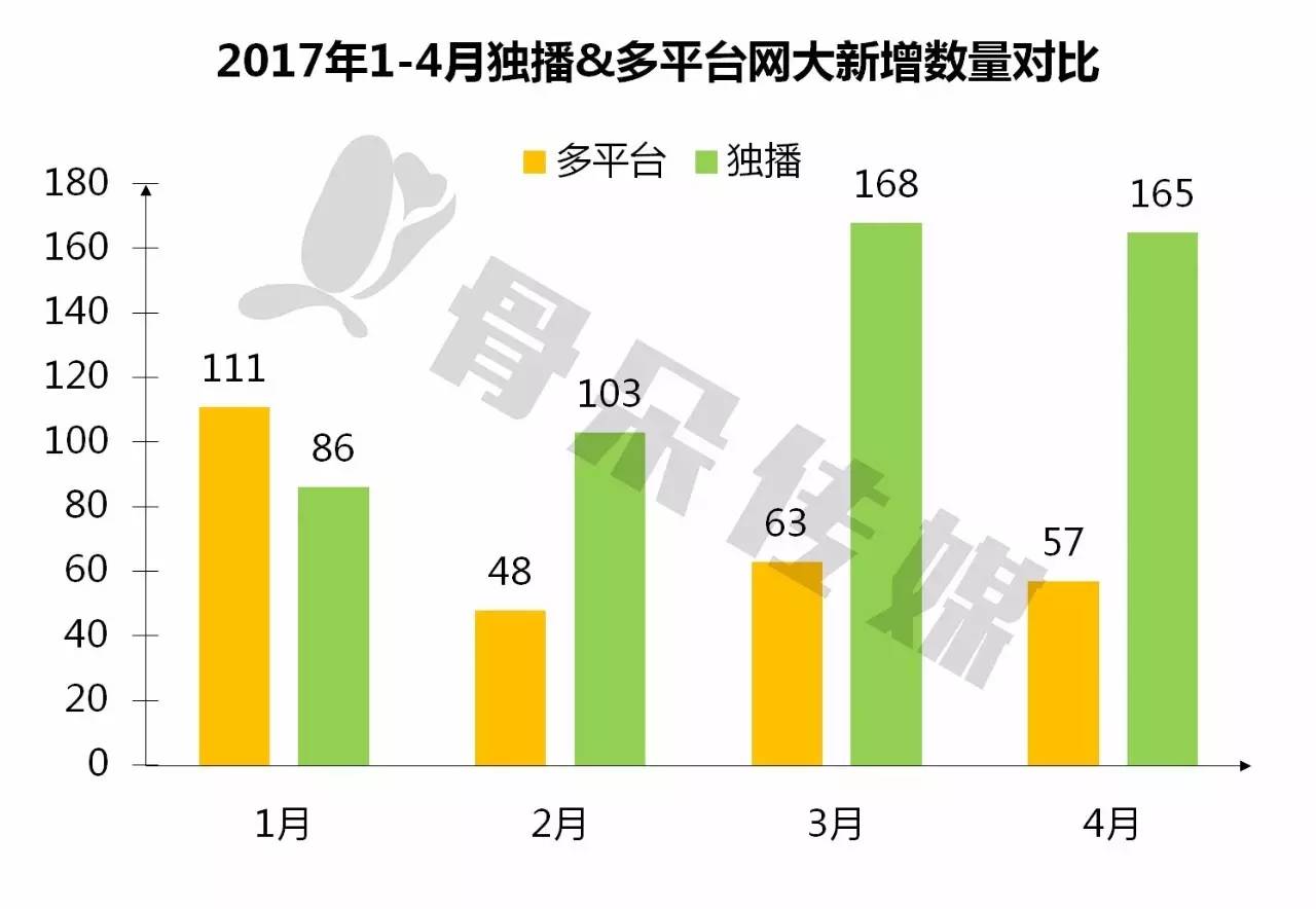 2017年4月,新增网大数量和播放量较3月均有所下滑。新增部数为222部,其中独播网大165部,多平台网大57部;播放量为52620万,其中独播网大播放量43847万,多平台网大播放量8773万。独播网大在各个方面均领先于多平台网大。