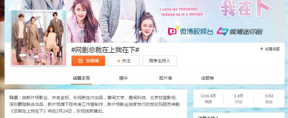 截至2017年5月10日,《总裁在上》微博系列官方话题阅读量2293.9万,讨论量4.4万;官方微博粉丝量超3万,达36129,遥遥领先一般网大的官方微博粉丝量;且官方微博中影片相关片段播放量均过万,微博粉丝互动佳,这样的的话题参与度亦是其他网大所不能比拟的。
