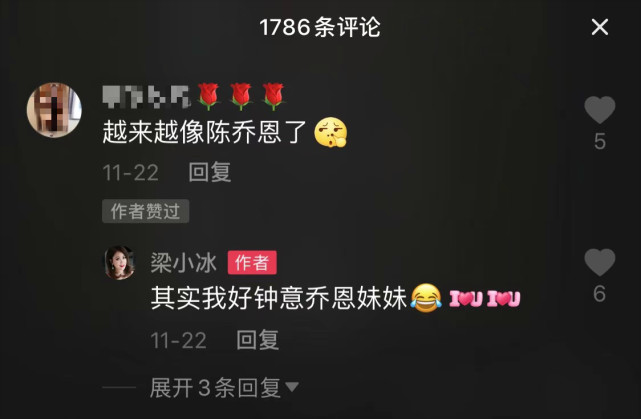 当有人表示她越来越像另一位女演员陈乔恩时,梁小冰会说自己“好钟意乔恩妹妹”。当粉丝提到她曾经的角色时,她真的很开心,也会很认真和大家互动,会回忆曾经的角色和作品,看得出她还是很感恩那段时间的。