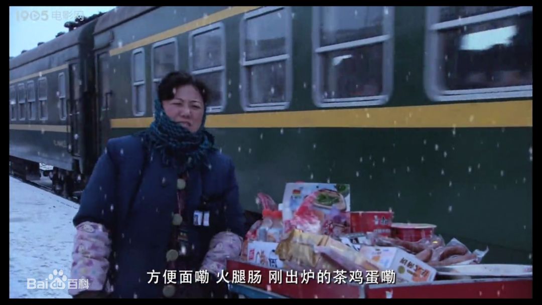 在他们的共同努力下,车终于开通了,新都站到了,旅客们纷纷下车买东西。在这样一个冰天雪地里,售货员还在风雪中,为了生计卖食品。
