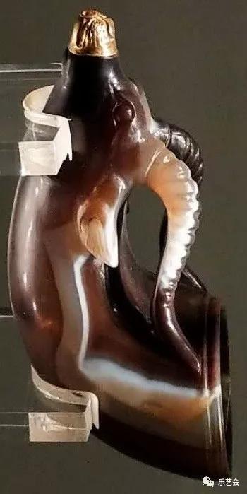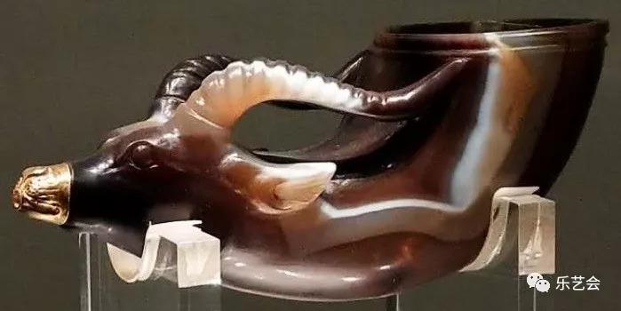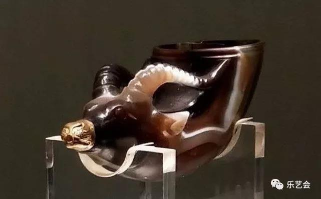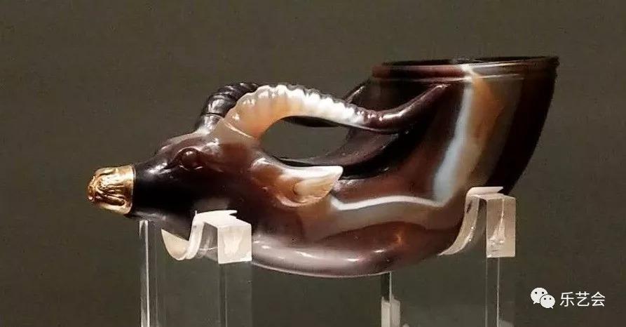 这件玛瑙杯的产地目前学术界仍有争议,但其造型是西方一种叫“来通”的酒具却成为专家学者的共识。“来通”是希腊语的译音,有流出的意思,大多做成兽角形。一般在酒杯的底部有孔,液体可以从孔中流出,功能如同漏斗,用来注神酒,当时人们相信用它来注酒可以防止中毒,举起“来通”将酒一饮而尽是向神致敬的表示,因此也常用于礼仪和祭祀活动。
