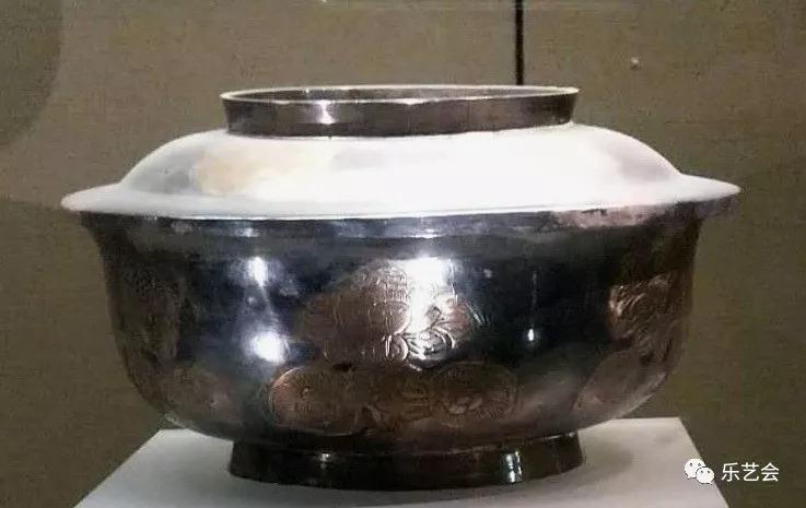 银碗出土于唐代何家村窖藏,碗高3.6厘米,口径11.2厘米,重152克。腹部捶打出均等的14条水波纹,其间錾刻飞禽、走兽,陪衬以花草,山岳,碗内底中心还贴焊着一只鎏金海兽,动静有节,生动有趣。