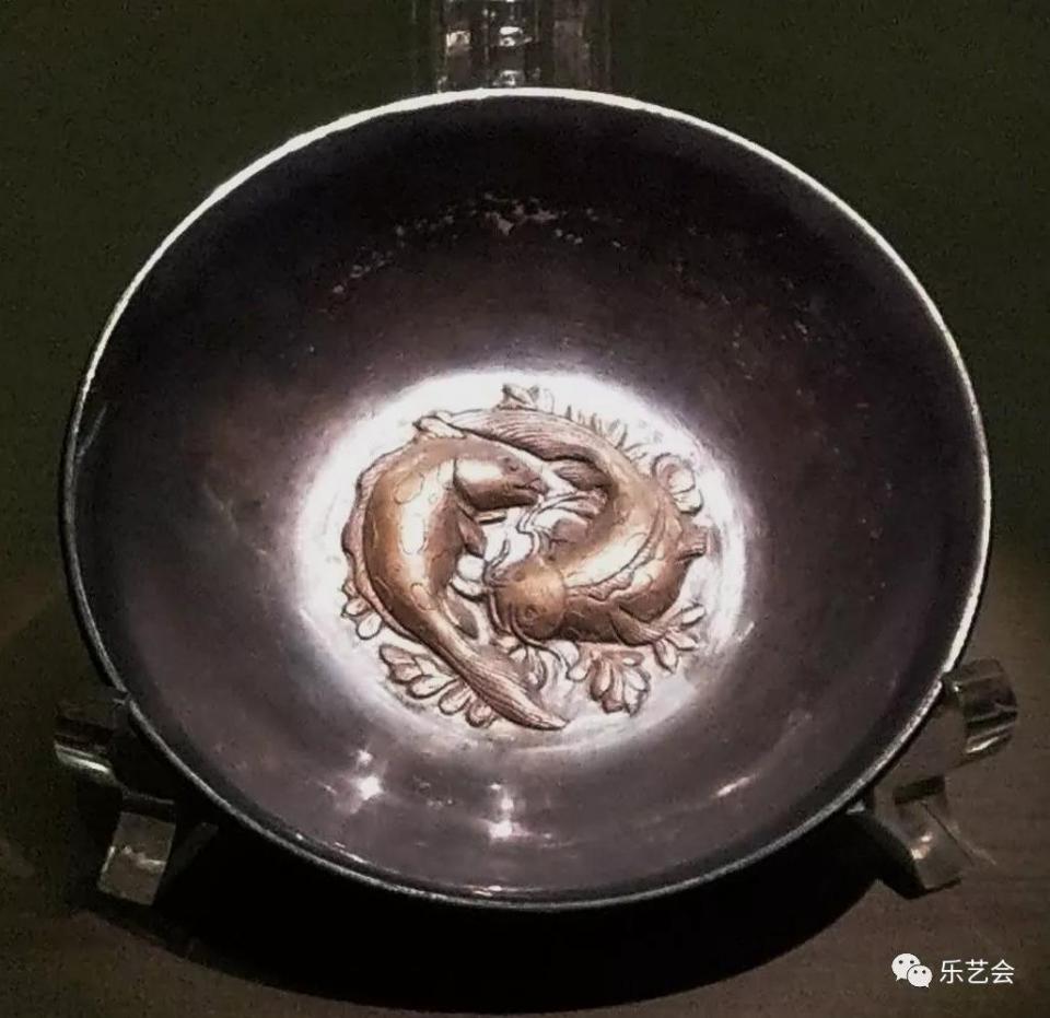 何家村窖藏共出土了两件鎏金双鱼纹银碗,造型和大小基本相同。碗底内有两条鎏金的鱼,当碗内盛满水时,水波流动,碗底的小鱼就如同在水里游动一样。