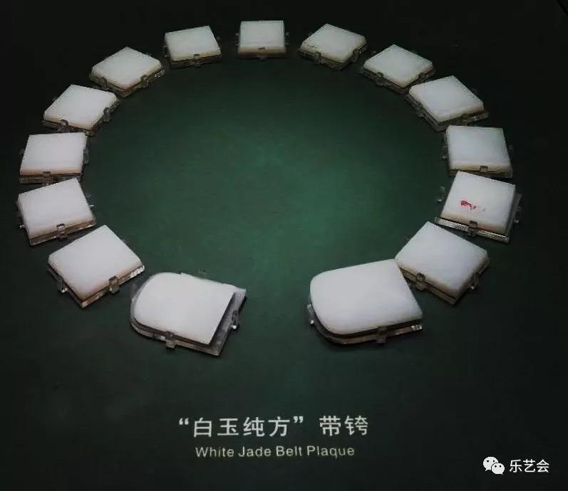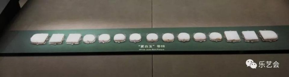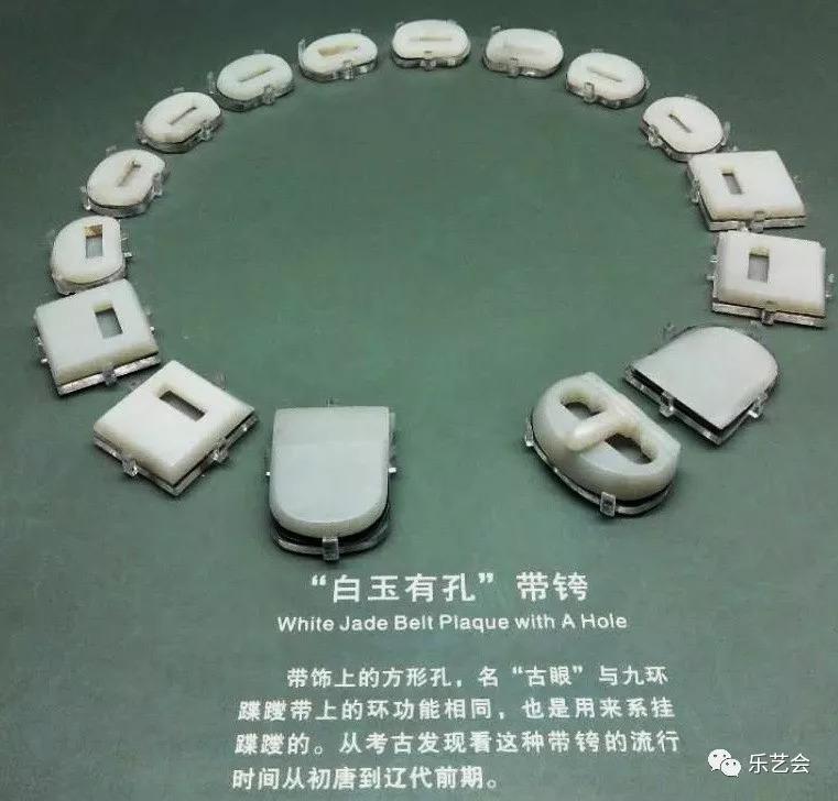 这件白玉带饰由四块方胯,九块半圆形跨、两块圆首矩形銙和一个玉带扣组成,共有16件。带饰上的孔和蹀躞带上的铰链功能相同,也是用来系挂物品的。