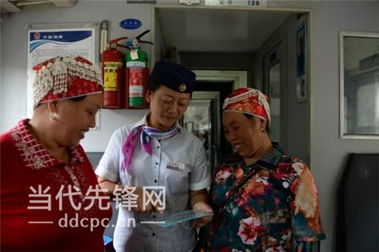 乘务员正跟苗族阿妈们解释信息公告栏的作用。葛雷 摄 “我参加工作23年了,跑过‘黄果树号’‘舞阳河号’等旅游专列,跑过渝黔线、贵昆线,唯有此‘慢火车’,最‘接地气’!”广播员薛峥说,与普通列车相比,慢火车上的服务工作要琐碎得多,事事都要为乘客想到、做好。
