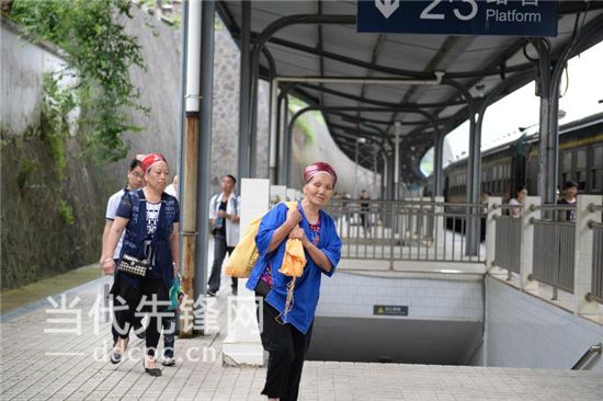 10点30分,苗族妇女吴文珍用扁担挑着两箩筐农产品上了5639/5640次列车,她热情地用苗语和列车员打着招呼。