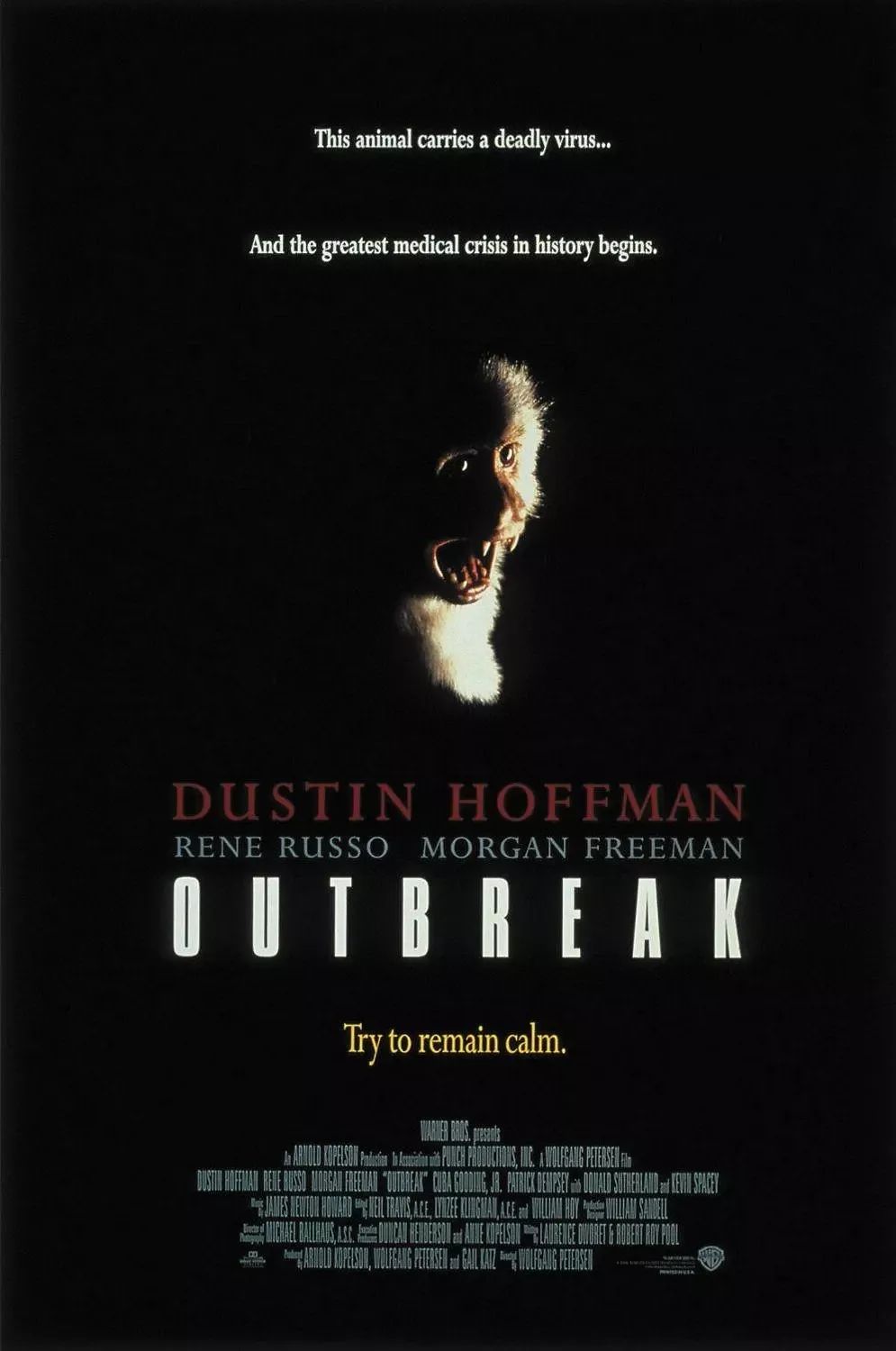 7,极度恐慌,1967年,在非洲的扎伊尔莫他巴河谷,美国的雇佣军兵营中被一种突如其来的疾病肆虐,死亡人数不断攀升。军医抽取感染血样离开后,整个军营被炸弹摧毁,附近树林中的白脸猴发出阵阵惊叫声…… 直到90年代,一个美国年轻人在非洲扎伊尔捕捉到一只小白脸猴,并带回国出售。由于不合买主要求,年轻人将猴子放生,之后一种新型疾病在旧金山的香柏溪镇上蔓延。美国传染病研究所上校军医山姆及同事立刻展开研究和救治工作。由于疾病传染性极高,政府紧急出动军队封锁镇子,想要逃离者格杀勿论。