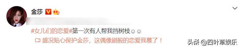 比如说盛况贴心保护金莎的花絮,就被金莎转发出来了,并且配上的文案是“第一次有人帮我挡树枝”,另外节目组的花絮标题也很搞事情,弄上了“这偶像剧般的恋爱我慕了”。
