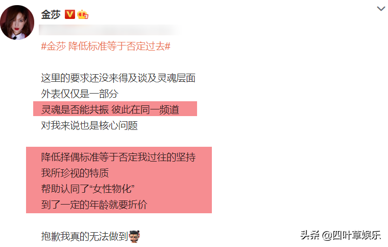金莎不愿意迁就,还特意发文表示道:“抱歉,我真的无法做到。”