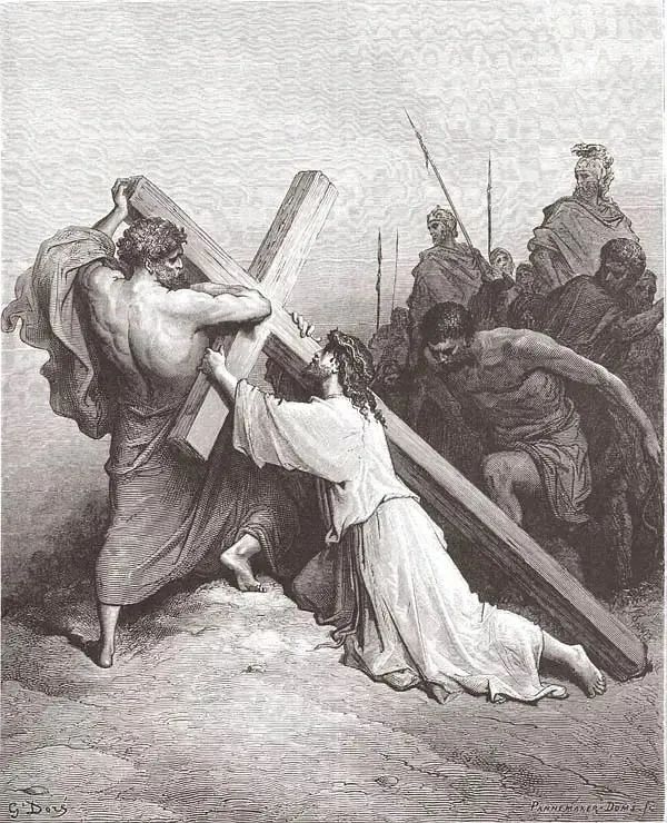 在电影的开头威拉德回到家中时,他抬头便看到墙壁上挂着古斯塔夫·多雷创作的圣经画,其典故来源于《新约·马太福音》的第27章,讲的是西门为耶稣背负十字架的故事。
