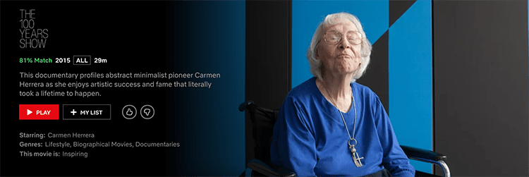 carmen herrera 1915年出生在古巴,是世界上现存岁数最大的当代艺术家。在81岁之前,她甚至没有卖出过一幅作品。这部「百年秀」记录了她因为国籍、性别而被人一直忽略的不幸故事,但是结果最终是鼓舞人心的,herrera 用她的创造性和耐力让自己拥有了独一无二的一生。