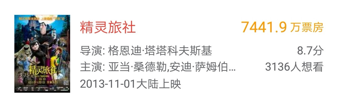 值得一提的是,“精灵旅社”系列动画在中国的票房一直持续走高。2013年11月上映的《精灵旅社》,作为系列开启之作,在中国斩获了7400多万的票房。