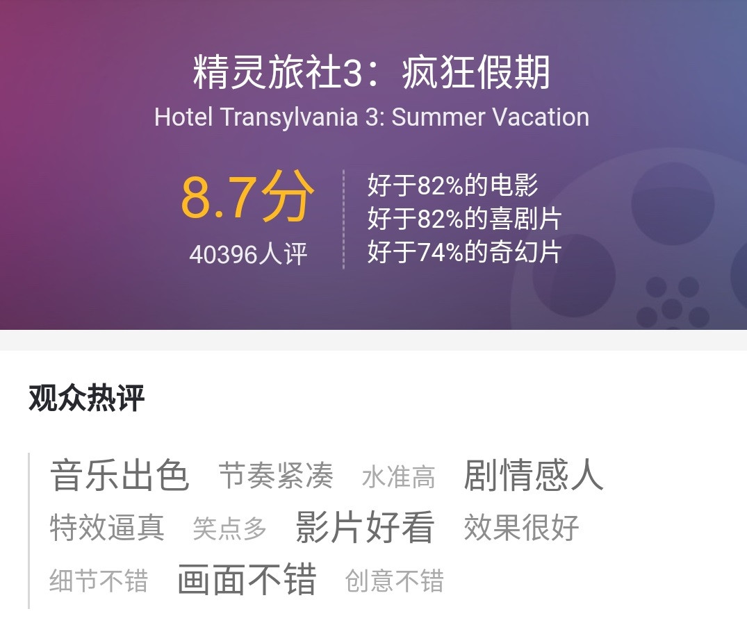 目前《精灵旅社3》的猫眼评分为8.7分,有超过4万名购票观众为其打分,“音乐出色”,“剧情感人”,“画面很棒”等关键词也出现在观众们的好评中。
