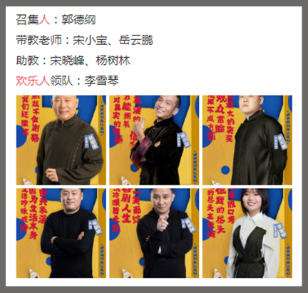 另外参加过该节目的宋小宝和岳云鹏也会以带教老师的身份回归舞台。包括助教宋晓峰、杨树林等,就连李雪琴也身兼“官职”,作为换了人的领队现身。