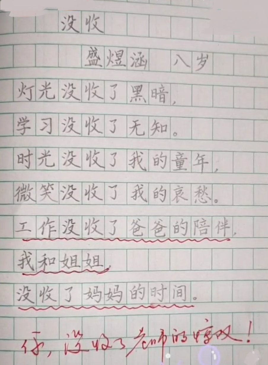 从这位8岁孩子的文章中,我们能够感受到什么才是真情,同时也能够从字里行间看到一种现实,这种现实似乎是“剥夺”了孩子们快乐的时光,也让很多父母感到惭愧,没有太多的时间来佩服孩子,正如文中所说的一样“工作没收了爸爸的陪伴”,也可以看出父母为这个家庭在默默付出着,看看这样的作文,谁都会鼻子一酸,是感动,是理解,也是一种无奈。