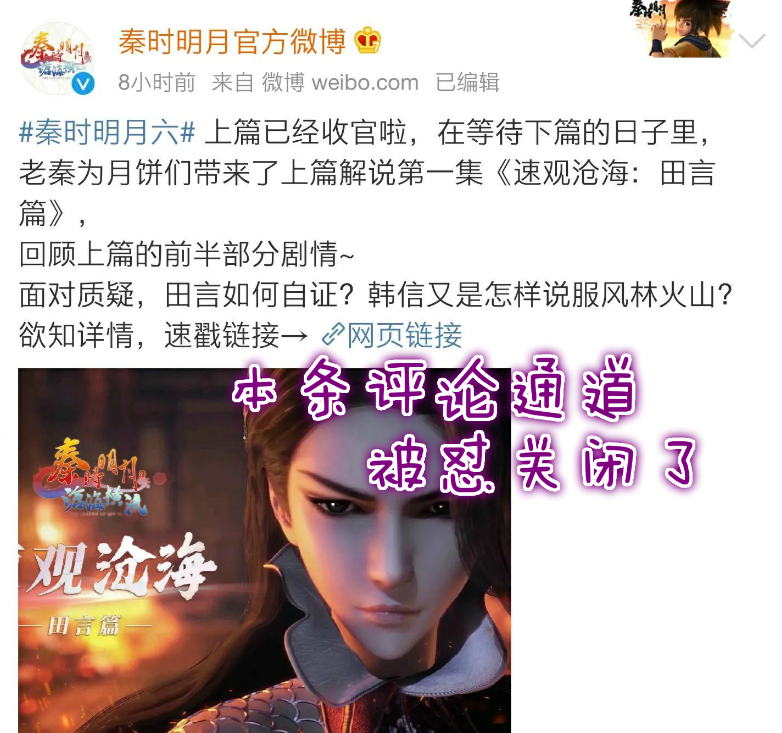 值得一提的是面对一大波怒气冲冲的真爱粉,秦时明月的官方微博相关评论通道都被关闭了……