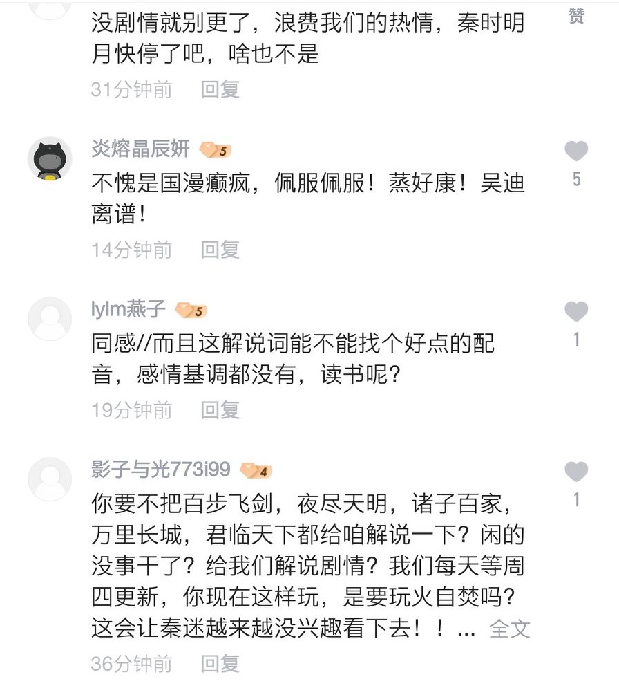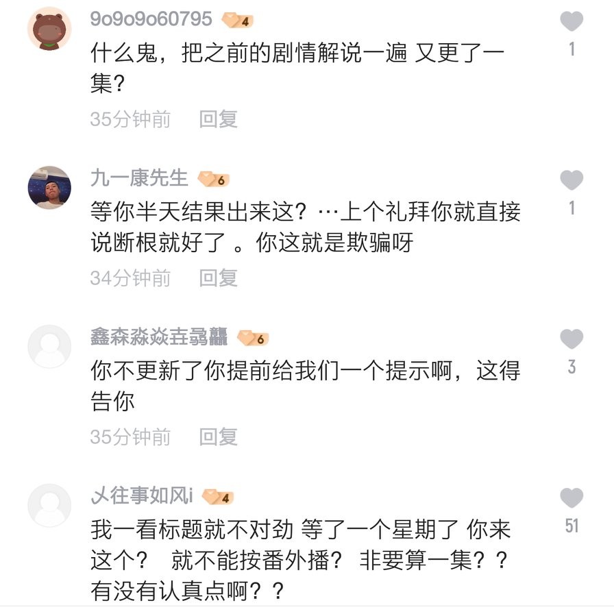 很多网友就直言,更不下去了就明说,停更一周又何妨?不丢人!然而既更新不下去又强行更新,拿一段解说来滥竽充数,这算是为了流量还是为了流量?