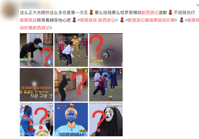 从已有评价来看,观众批评的火力主要集中在节目疑似抄袭韩国综艺《新西游记》上。有观众做出两档综艺对比图,表示看图说人名、戴尖头帽踢足球两个游戏设定都高度雷同。