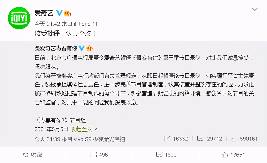 5月5日凌晨,爱奇艺的官方微博深夜发文称,“接受批评,认真整改!”