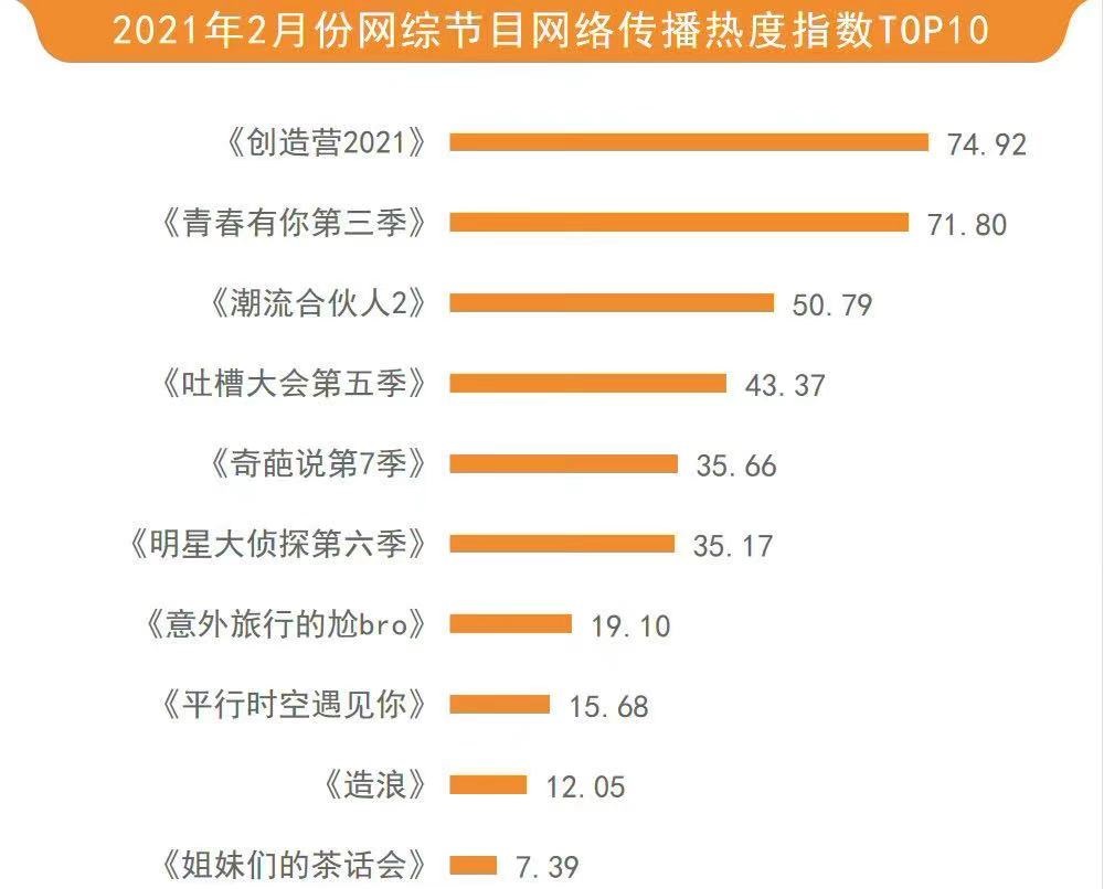 芒果tv的《明星大侦探6》上榜,b站的《造浪》上榜,优酷一个节目都没有。今年的《创造营2021》和《青春有你3》同时开播,而且都是选男团,是直接的竞争对手。目前来看,《创造营2021》还是比《青春有你》火一点。