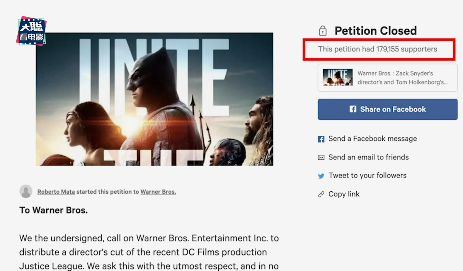 2017年11月17日院线版《正义联盟》上映,随后在国外热门的民间请愿网站上,影迷就写给华纳一封长长的信,网友自愿签名要求华纳释放导剪版《正义联盟》。