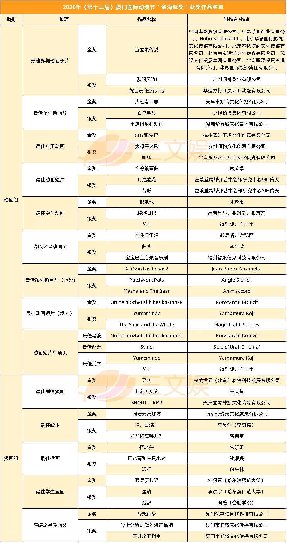 11月11-13日,2020年第十三届厦门国际动漫节在厦门举行,“金海豚奖”动漫作品大赛评选揭晓。