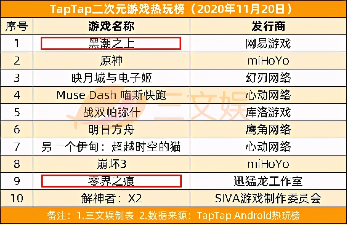 除此之外,本周还有1部游戏新晋榜单,即迅猛龙工作室发行的《零界之痕》。《零界之痕》是一款二次元动作arpg手游,截至11月20日,该游戏在taptap上有11.44万人安装,72.22万人关注,本周排名第九。