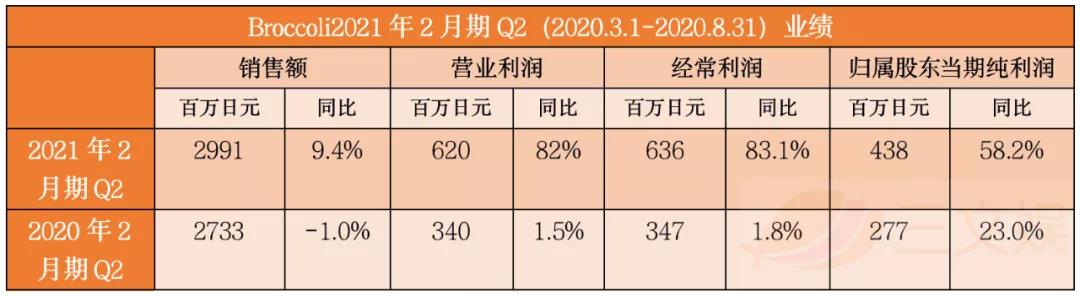- broccoli季度营收29.9亿日元同比增长9.4%,净利润4.38亿日元同比增长58.2%。