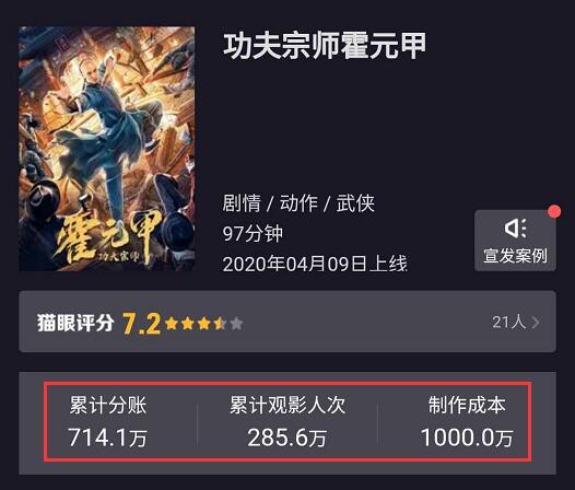 也就是说,1000万制作成本的《功夫宗师霍元甲》,分账票房却只拿到714万,这很明显,并未收回制作成本,片方亏个底朝天,就更别谈盈利了,那么,这事做不做得呢?