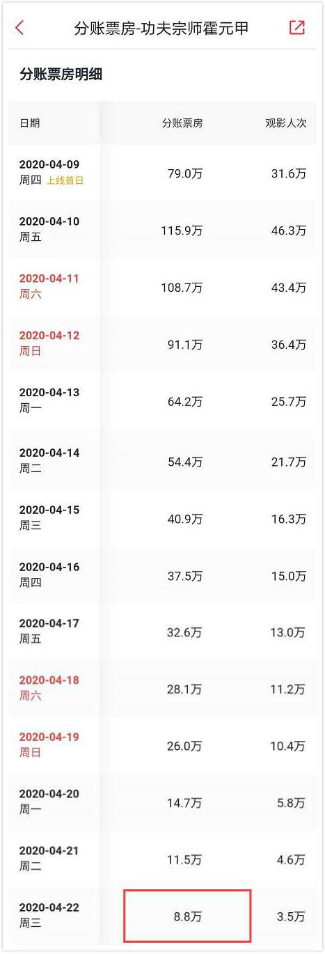 上线次日表现尚可,单日最高分账票房拿到115万,不过,从那之后便一路狂降,4月22日仅收8.8万,从那之后未能产生任何分账票房收入,宣告下线。