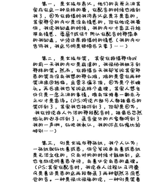 关于思诺一角的小记,洋洋洒洒就是几千字的介绍和分析,对角色的理解细腻到一个表情、一句台词甚至是身边的一个道具。