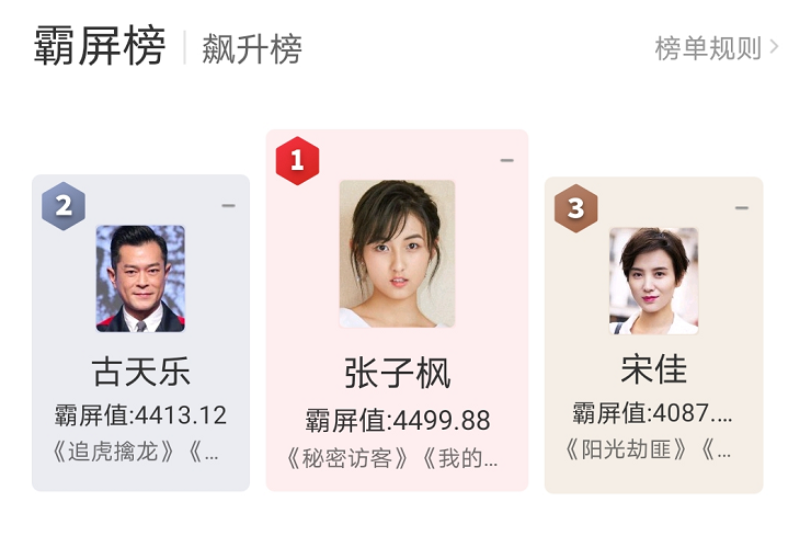 but,在电影榜单的官方数据中,张子枫的的霸屏值依旧高居首位,排在其后的是70后金像影帝古天乐和80后金鸡影后宋佳。