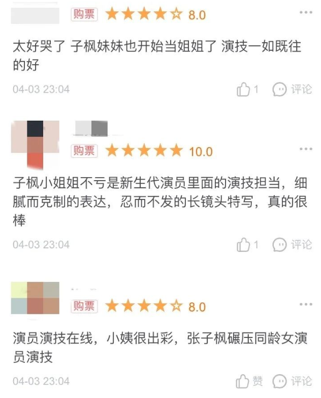 关于张子枫在这部电影中的表现,大多数网友都用“远超于同龄人的演技”来形容,国民妹妹是一个爱称,但她的演技的确是在向“姐姐”的方向快速发展着。