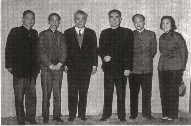 1964年10月28日,司徒慧敏(左一)与夏衍(左二)等陪同国务院总理周恩来(右三)会见荷兰国际著名导演尤里斯·伊文斯(左三)