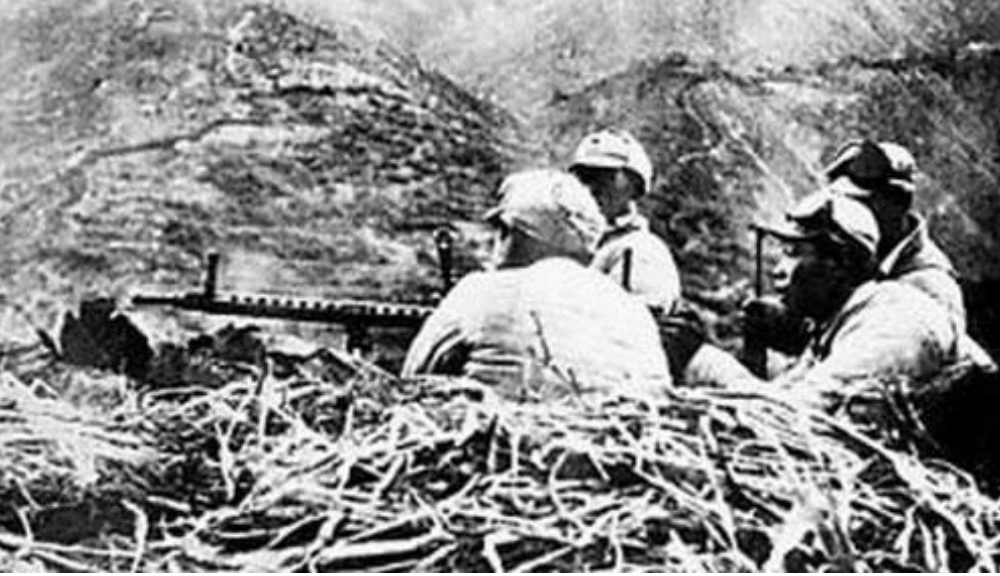 ▲昌都战役中伏击藏军偷袭部队的解放军民三六式重机枪班组,正负射手都装备了风镜已保证在恶劣天候下作战,击枪巢表面亦有草木伪装
