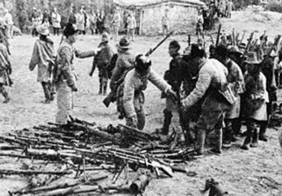 ▲缴械的藏军,除了步枪和机枪外,地面上的武器堆里还有迫击炮和反坦克枪