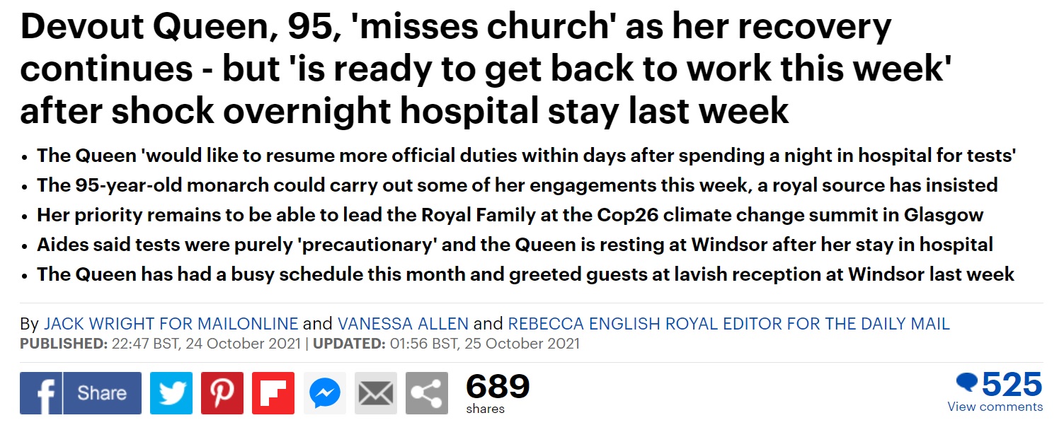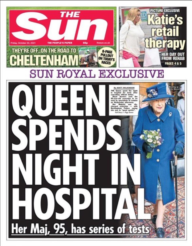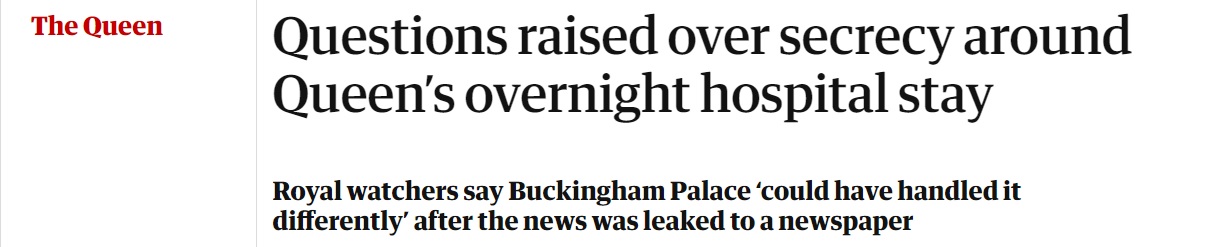 在女王取消北爱尔兰之行后,皇室没有给出任何解释,直到《太阳报》头版新闻刊登了女王住院的消息后,他们才证实确有此事。
